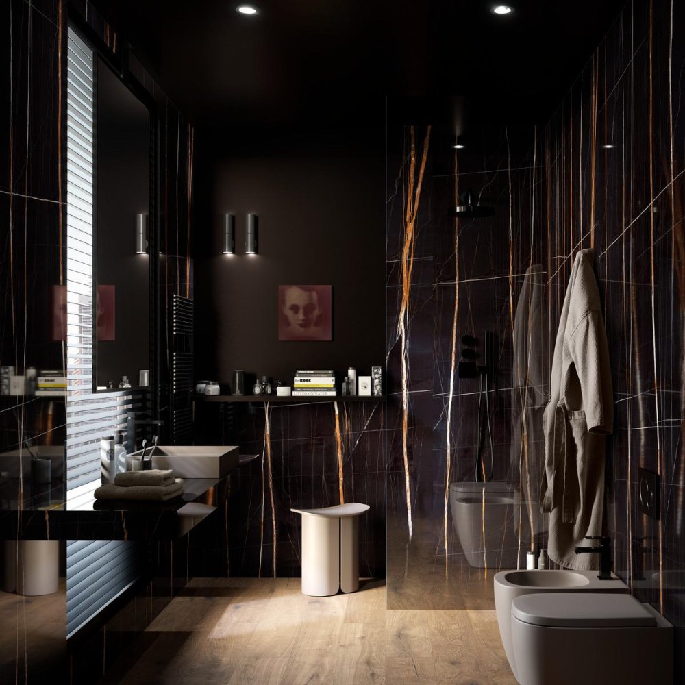 Bring the timeless elegance of marble into your space with Marazzi ALLMARBLE Sahara Noir. Inspired by the striking natural beauty of Sahara Noir marble, this large-format porcelain tile (60×120 cm) features a dramatic black background enhanced by bold golden and white veining. The polished surface accentuates its luxurious character, adding depth and luminosity that elevate any interior.