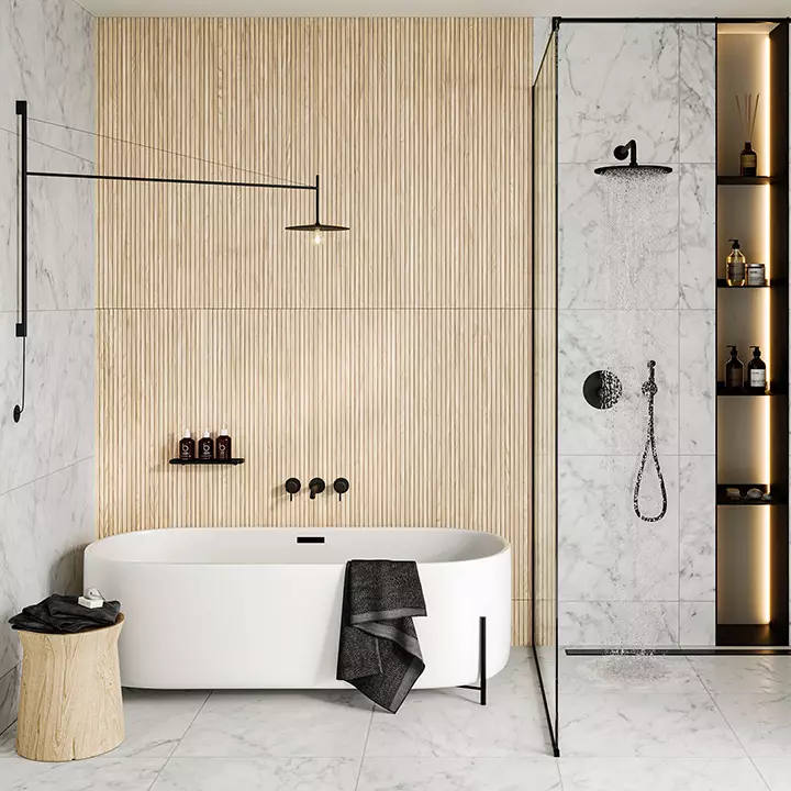 White-body ceramic wall tiles with a refined wood-inspired design. With a rectified finish and subtle relief texture, they create a seamless, modern look.